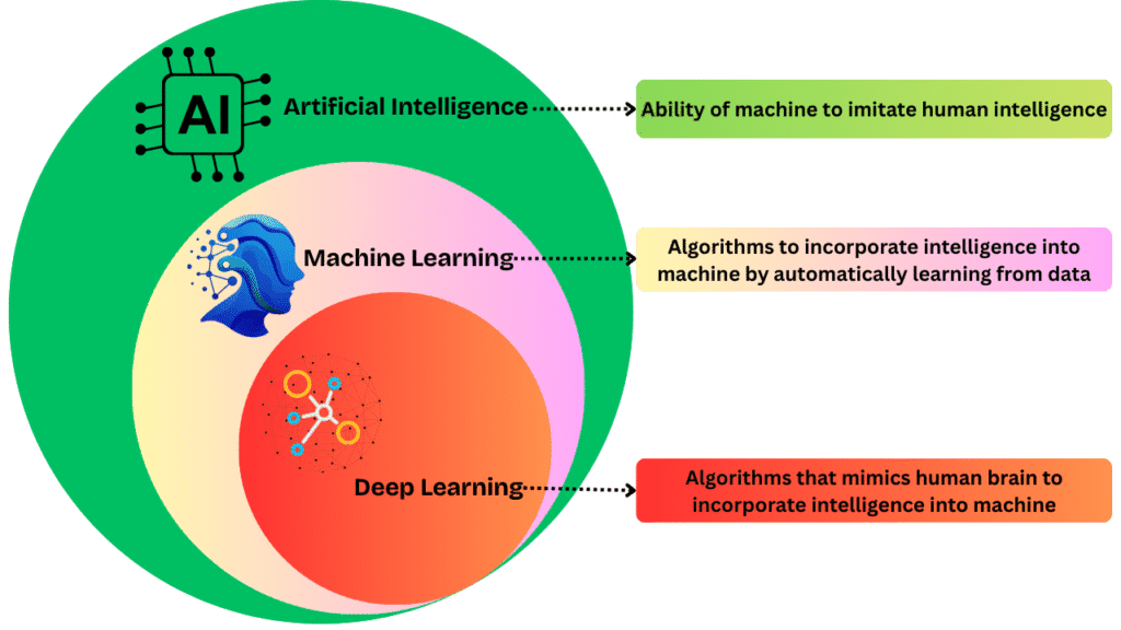 • Artificial Intelligence (AI): The broadest concept. AI refers to the design of machines or computer systems capable of performing tasks that would normally require human intelligence. This includes decision-making, problem-solving, language understanding, and pattern recognition.
