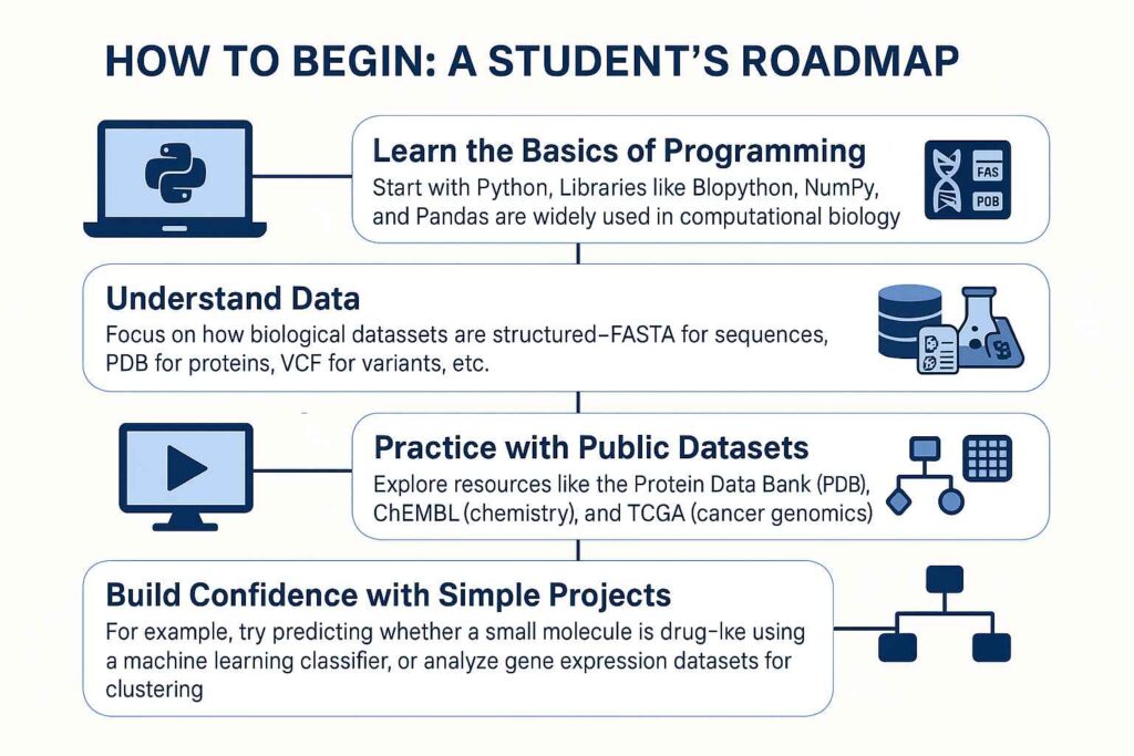 • Understand Data: Focus on how biological datasets are structured—FASTA for sequences, PDB for proteins, VCF for variants, etc.