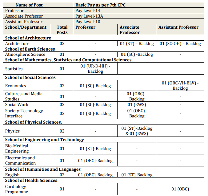 These posts are spread across different schools and departments, including Architecture, Atmospheric Science, Statistics, Economics, Culture and Media Studies, Social Work, Society-Technology Interface, Physics, Bio-Medical Engineering, Electronics and Communication, English, and Cardiology Programme. Several of these positions are backlog vacancies reserved for SC, ST, OBC, EWS, and Persons with Disabilities categories.
