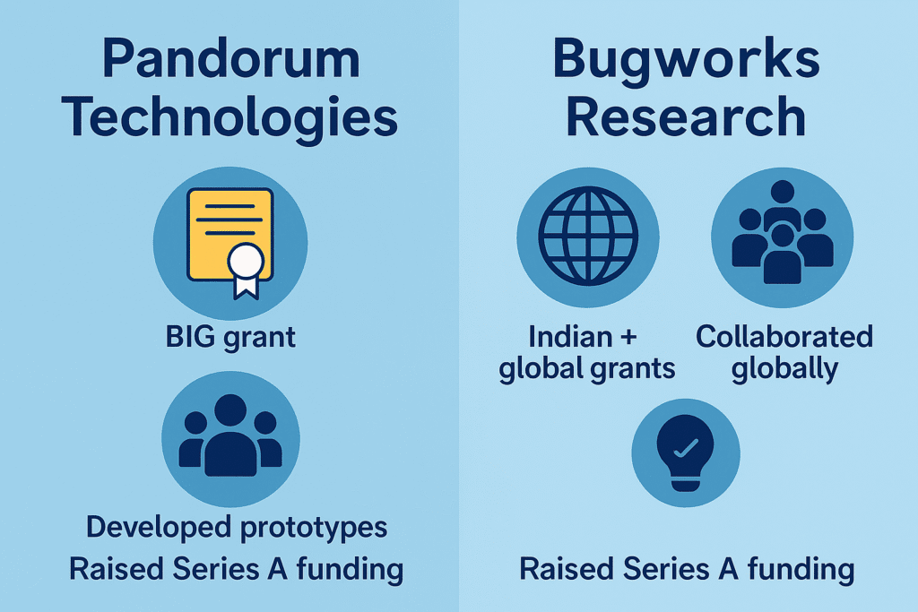 - Pandorum Technologies: Started with BIG and SBIRI grants, developed prototypes at C-CAMP, then raised Series A funding. They balanced grants and VC money to build a strong team and technology pipeline.