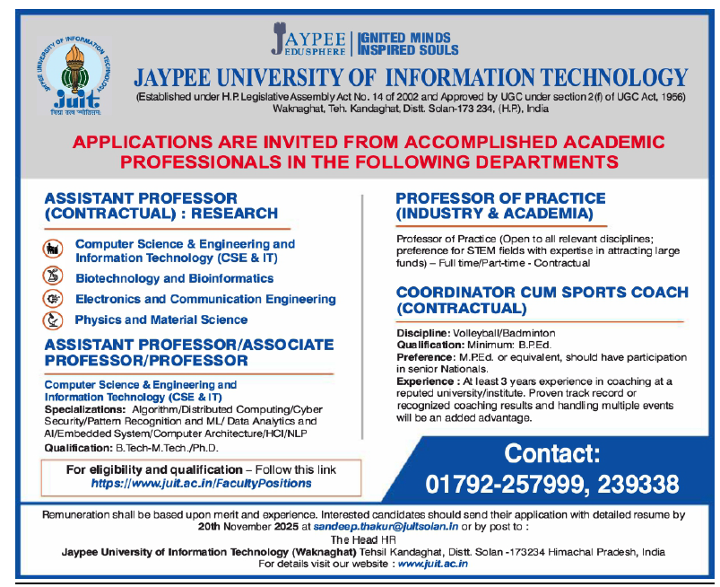 Jaypee University of Information Technology (JUIT), one of India’s well-known private universities in Himachal Pradesh, has released its 2025 recruitment notification inviting applications for Teaching, Research, and Non-Teaching positions.