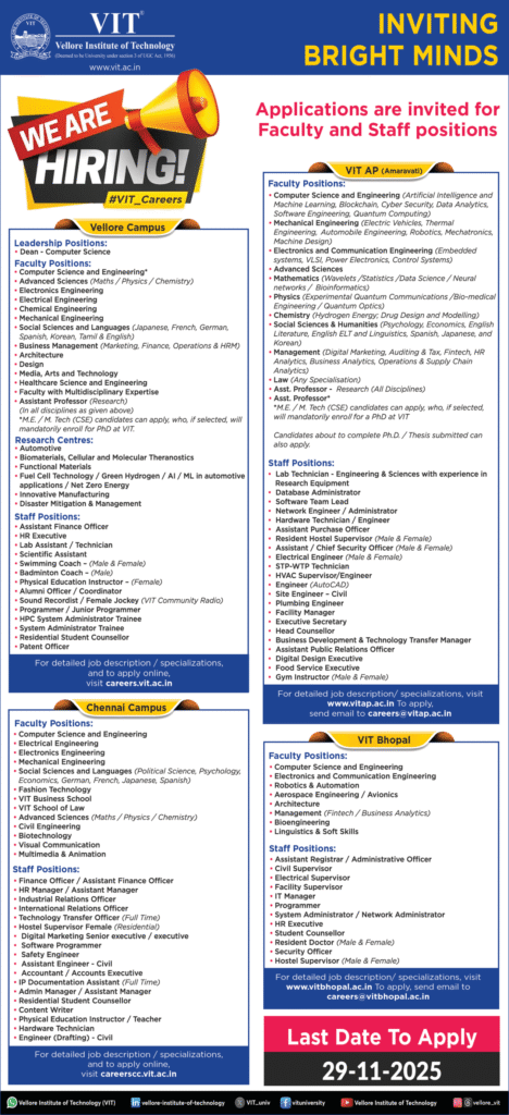 VIT Recruitment 2025: Faculty and Staff Openings Across All Campuses Apply by 29 November 2025